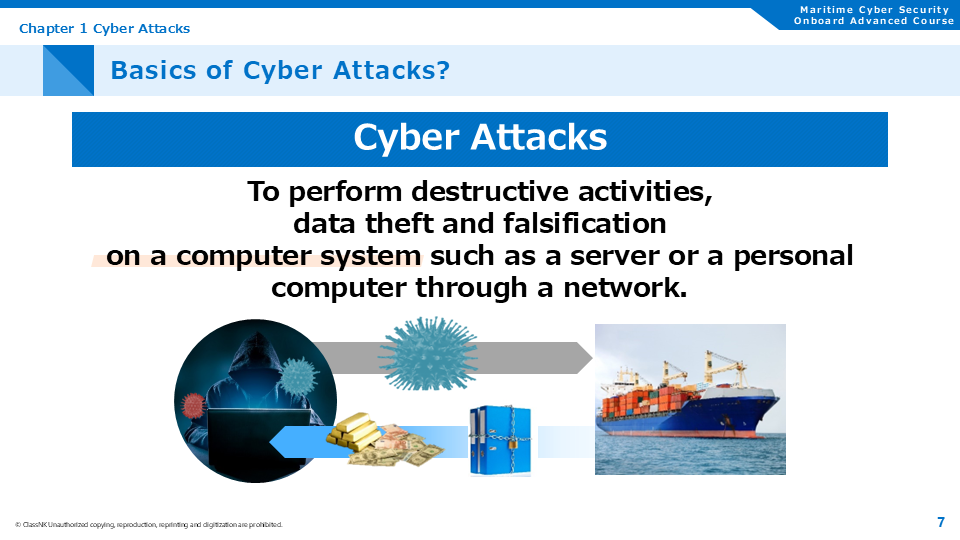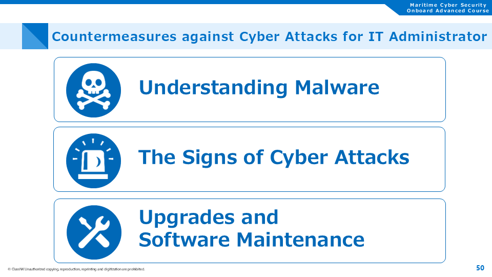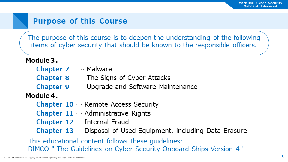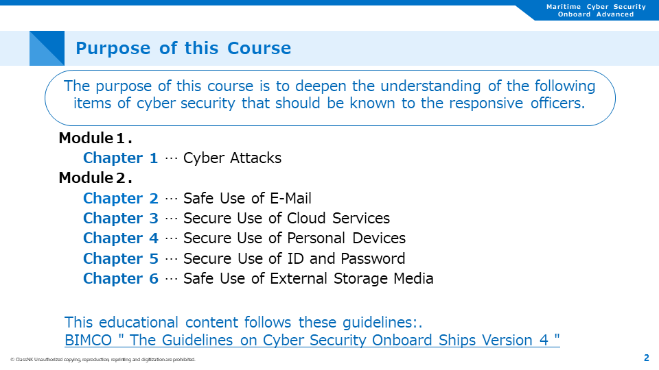 *This course covers the same contents as that in the “Maritime Cyber Security Onboard Basic Course – for Crews and Officers –” and adds advanced materials for responsible officers on board.