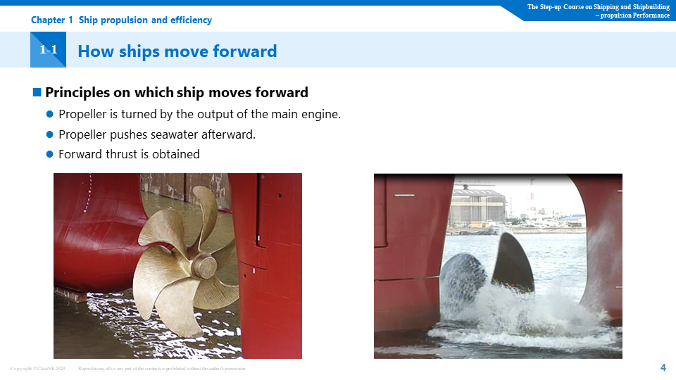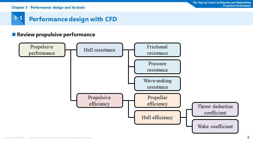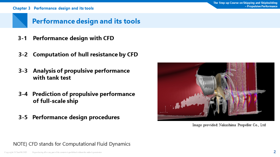 In the maritime industry, there is significant attention on the urgent challenge of reducing greenhouse gas (GHG) emissions. One key technology for achieving this is the enhancement of ship propulsion performance. However, this technology is highly specialized and can be difficult to comprehend. In the E-Learning course that we are offering, intended for not only naval architects but also individuals requiring knowledge about ship performance, we provide a comprehensive understanding of ship design. This encompasses topics ranging from the principles of propellers to the influence of hull forms and energy-saving appendages on performance. Using videos of water tank tests and Computational Fluid Dynamics (CFD), we will deliver explanations in a clear and understandable manner.